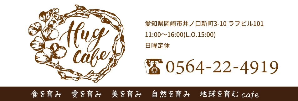 ハグカフェは、はぐくむカフェ。 食を育み、愛を育み、美を育み、 自然を育み、地球を育むcafeへ。 厳選した調味料と油のみを使用し、オーガニックや無農薬野菜を使った “こころと身体にやさしいランチ”を提供しています。 テイクアウト&オードブルもございます。 Hug-caf'e(ハグカフェ) *〒444-2132 愛知県岡崎市井ノ口新町3-10 ラフビル101 *0564-22-4919 *11:00〜16:00 日・水曜定休
