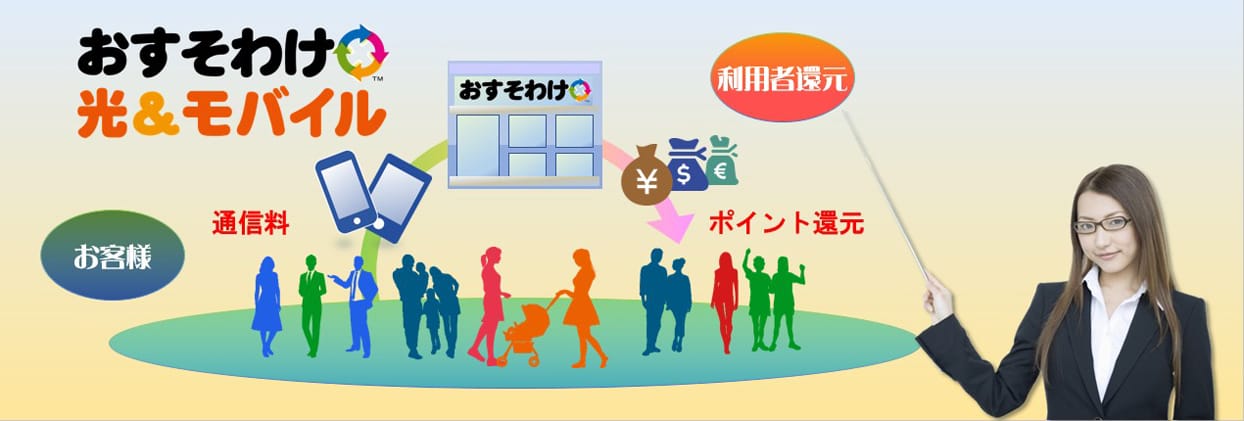 特殊な取り扱いとして、還元型の通信サービス「おすそわけ光&モバイル」の加盟店として、光回線とモバイル回線を提供しています。