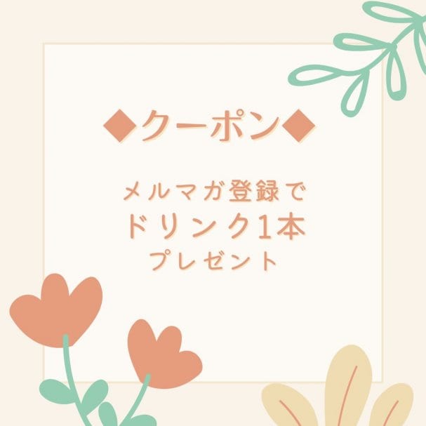 メルマガ登録でドリンク1本プレゼントいたします。ご予約時クーポン獲得された方全員のニックネームをお知らせ下さい。