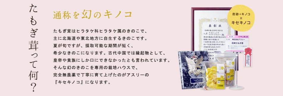 たもぎ茸ってご存知ですか? たもぎ茸はヒラタケ科ヒラタケ属のきのこで、主に北海道や東北地方に自生するきのこです。夏が旬ですが、採取可能な期間が短く、希少なきのこです。古代中国では縁起物として、皇帝や貴族しか口にできなかったとも言われています。 そんな幻のきのこを専用の栽培ハウスで、完全無農薬で丁寧に育て上げたのがアスリーの『奇跡のキノコ・花咲たもぎ茸』です。 株式会社アスリー:https://www.athree.info/