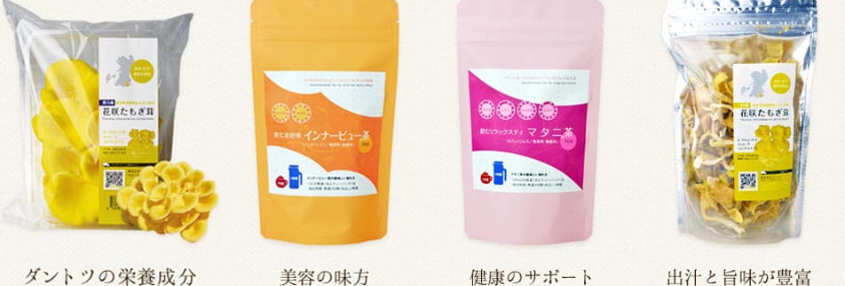 このショップでは、黄色いきのこ「花咲たもぎ茸」に関連した商品を中心に、地元熊本の「健康にいいモノ」