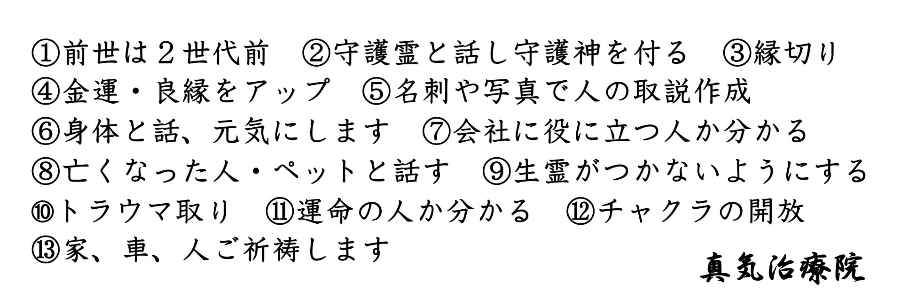 私にできること・・・ ①前世は2世代前まで見ます ②守護霊と話し守護神を付けられます ③縁切りの儀式で縁を切ります ④金運・良縁をアップ! ⑤名刺や写真で気になる人がよく分かる ⑥身体と話し、不調の場所が分かり元気にします ⑦雇用の相談(採用の合否)いたします ⑧亡くなった人やペットと話します ⑨生霊がつかないようにする ➉トラウマを取る! ⑪運命の人か分かります ⑫チャクラの開放 ⑬家、車、人ご祈祷します *遠隔で霊視出来ますので遠方でも大丈夫! 真気治療院 https://kiatec.voo.jp/