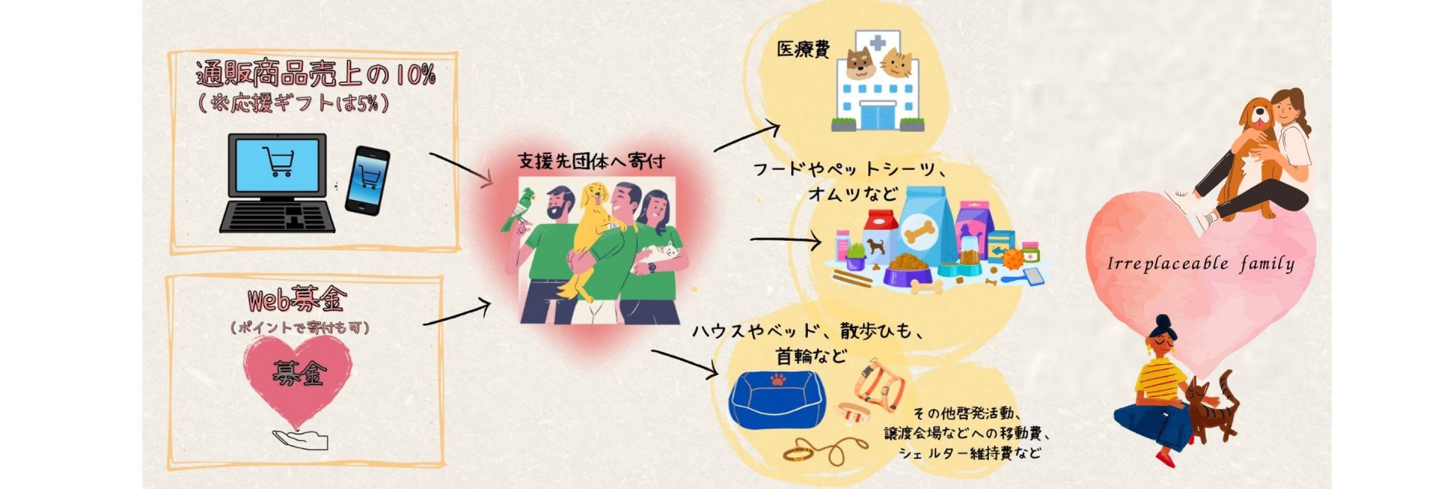 保護犬猫の新たなご縁を繋ぐまでの食事代、病気から守るためのワクチン代、ケガ・病気等の医療費代。 たくさんの愛と笑顔に包まれ、終生しあわせに暮らせるための適正飼育や終生飼育の啓発活動資金として寄付させていただきます。