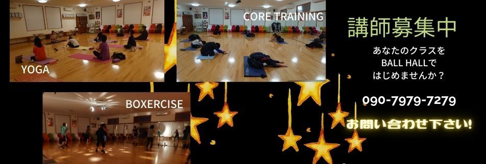 BALL HALLでは、「ダンス」「健康」「食」「婚活」など様々なイベントやレッスンを開催予定です。情報は今後、メールマガジンでご案内いたします。ぜひご登録いただき、あなたの健康で豊かな毎日にお役立てください。 【メールマガジン登録者には特典クーポンをご用意しています!】 ★イベント時の特典(○○無料券)ご利用 ★キッズレッスン初回体験でのご利用(無料) ★一般レッスン初回体験でのご利用(割引) のうちのいずれか1回のみ利用できます。 BALLHALL バルホール 090-7979-7279(担当/江田) |