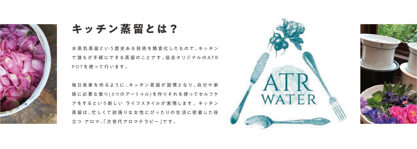 キッチン蒸留とは、水蒸気蒸留という歴史ある技術を簡素化したもので、キッチンで誰もが手軽にできる蒸留のことです。協会オリジナルのATR POTを使って行います。毎日食事を作るように、キッチン蒸留が習慣となり、自分や家族に必要な香りを作りそれを使ってセルフケアをするという新しいライフスタイルが実現します。 忙しくて欲張りな女性にぴったりの生活に密着した役立つアロマ、「次世代アロマテラピー」です。 協会HP:https://atrwater.jp/ 関連shop: https://tsuku2.jp/atrfun