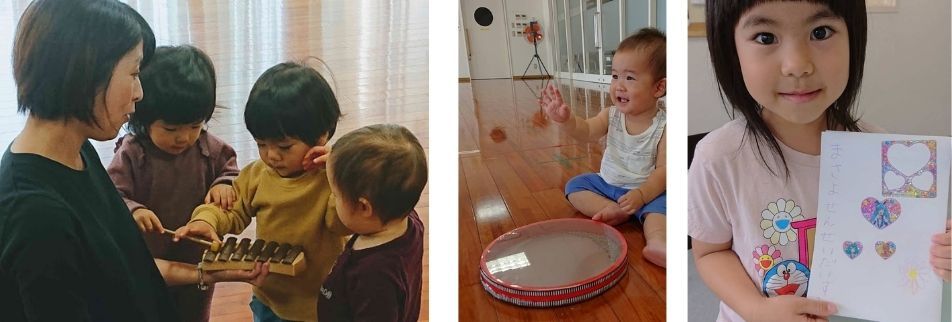 どちらも楽器をさわったり、歌いながらママとふれあっていくことで、想像力や表現力を育てる家庭ではなかなかできない音あそびがいっぱい。先生の伸びやかで透き通った歌声も心に響きます。ママもリフレッシュできる子育てのプラスアルファになるクラスです。