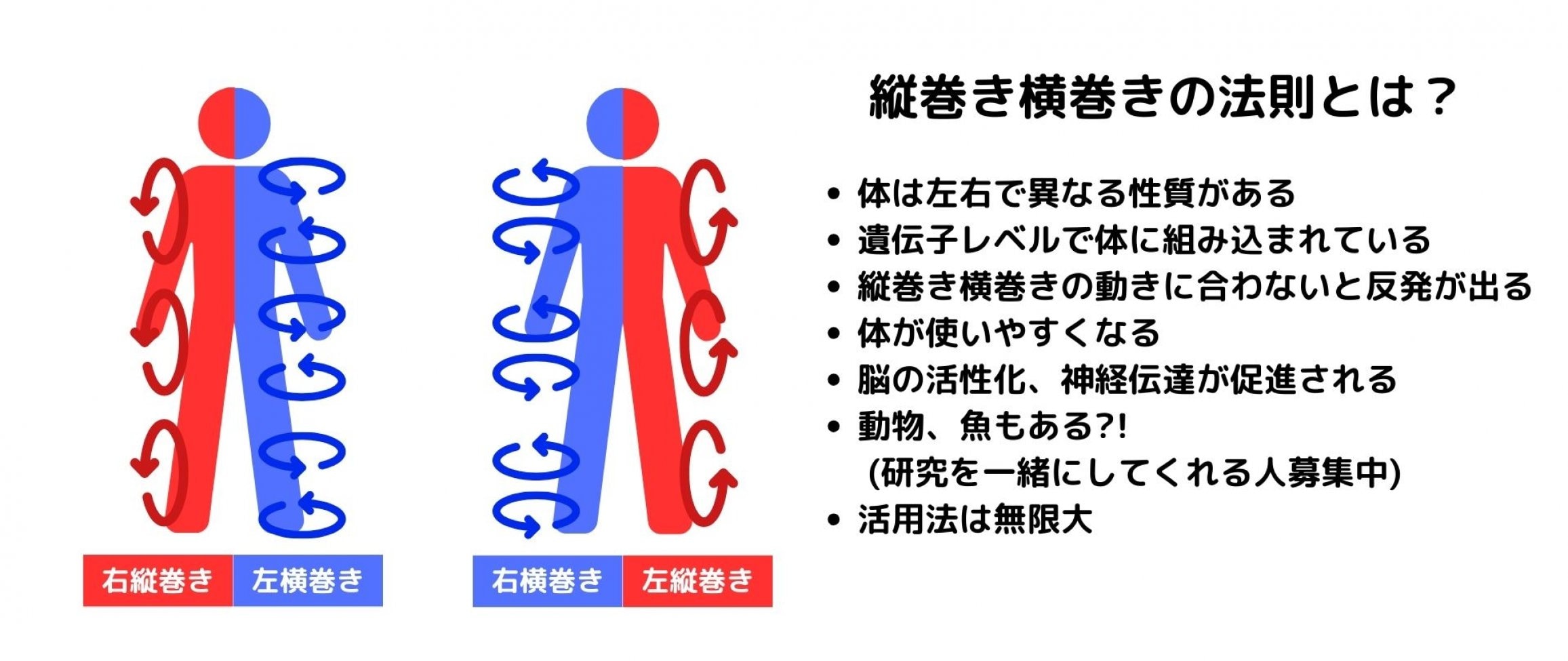 「縦巻き横巻き理論」を学ぶことで「自分の体ってこんなクセがあったんだ!」、「法則を使ったらすごく楽になった!」「この理論はおもしろい!」と思っていただける様な