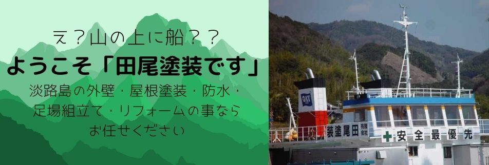 関西、淡路島塗装のことなら安心と信頼の実績で創業50年。建築・造船塗装、地元淡路島および他県でも活躍する塗装屋です。ちょっとした小さな工事から大きなビルやマンション工事まで塗装に関するお悩みを解決いたします。屋根・外壁・室内壁の塗り替え・その他の工事承ります。カビ・痛み・サビ止めの塗装などもお気軽にご相談ください。現地調査・お見積り大歓迎です。 有限会社田尾塗装/〒656-2222兵庫県淡路市野田尾551(休/日曜・祝日) ta-mo3@office.eonet.ne.jp tel:0799-64-0795