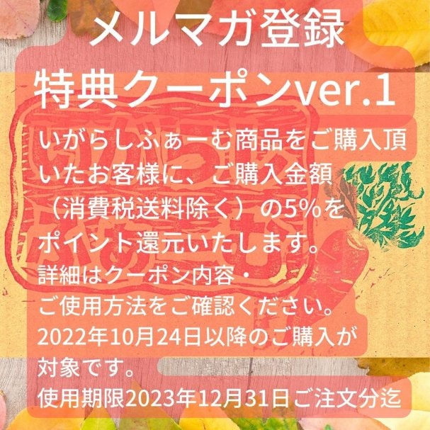 商品ご購入後に、メールの件名に【メルマガクーポンver.1】と明記の上、