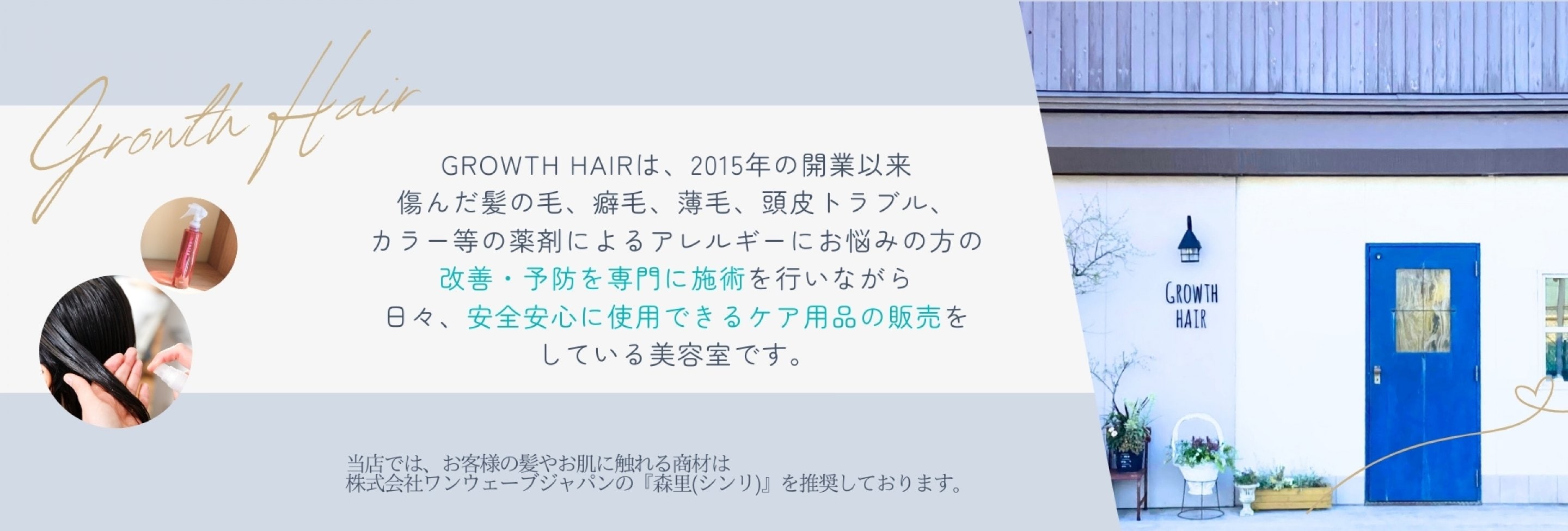秋田市の髪質改善ヘアケア商品を取り扱う髪質改善専門美容室「GROWTH HAIR/グロースヘアー」 傷んだ髪・癖毛や薄毛などで悩んでいる方へおすすめのヘアケア商品《森里/SHINRI》を販売しています。 髪質改善専門美容室が提供する、安心安全なシャンプーやトリートメント、髪と肌を第一に考えたヘアケア商品です。 髪のダメージ、くせ毛、うねり、パサつき等のお悩み。特に、ヘアケアを頑張っているのになかなか効果が出ない方へ。日々のホームケアの積み重ねが髪質改善のカギとなります。 住所:秋田県秋田市広面鍋沼58-1