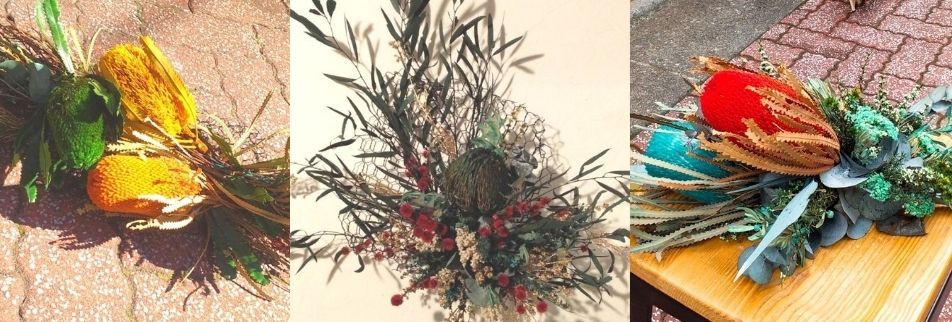 プリザーブドとは英語で「保持している」「生存している」という意味で、生花とドライフラワーの中間的な花です。西オーストラリアの原野で育つ花 ワイルドフラワー(WILD FLOWER)を特殊加工したものです。元々乾燥した厳しい気候に咲いているワイルドフラワーが持つ天然の清々しい香りもそのまま保ち続けます。そして加工してあることで柔らかい感覚があり、水の必要もありません。アレンジ後もそのままの状態で 約半年〜1年後にドライフラワーに変化していきます。オーダーメイドの作品は1点ものとなります。また光の加減などで画像との相違があると思われますが、多くの画像とともにサイズを記載していきますので参考にしていただければと思います。オーダメイドのアレンジメントのご要望では、メール(又はお店の問い合わせ)から、飾る場所、お客様のニーズを聞きましてから作品作りを行っていきます。ベースとなる葉(ユーカリ等)の色を緑or茶からお選び頂き、バンクシアの色(ナチュラル、赤、青、緑、黄)を決めて頂いてからアレンジメントさせていただきます。発送は2週間から1ヶ月の期間をいただくことをご了承ください。