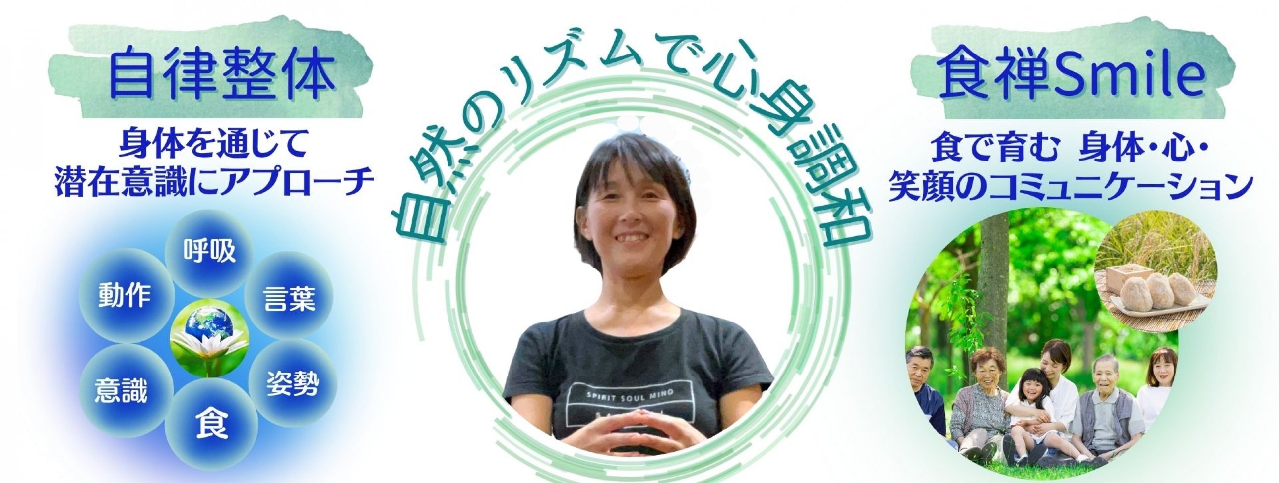 同時に、武学と関わる中で、自分の健康を自分で守るツールである「自律整体」を知り、さらにその中に禅法として食を通じた内容があり、実践しながら伝える活動をしています。