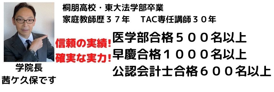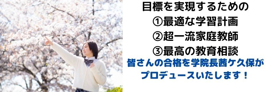 医学部受験専門プロ家庭教師、早慶・SFC専門家庭教師、はお任せ下さい! お子様一人一人に最適な教育プログラムをきめ細かく私・茜ケ久保が策定します 創業1984年、医学部500名、早慶1000名の合格実績(学院長、延べ) 超一流の講師×最高のコンサル ①医学部受験家庭教師=東大理三、慶応医学部 ②早慶受験家庭教師=早稲田・慶応、早大学院・本庄、慶応義塾・志木、早稲田佐賀 ③SFCの小論文・英語・AO入試 ④不登校家庭教師、高卒認定 ⑤留学準備、TOEIC、TOEFL ⑥入試直前逆転合格
