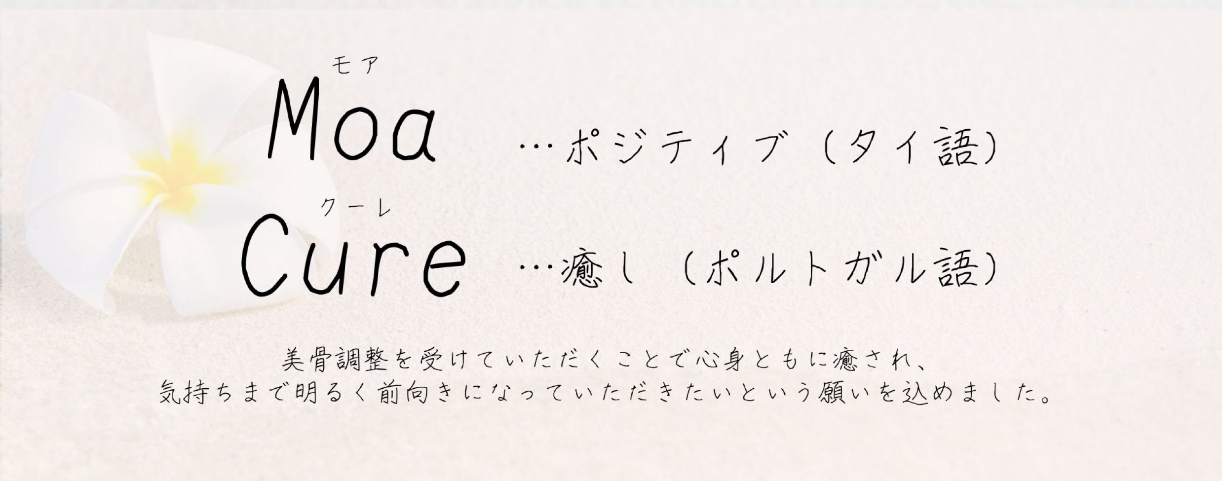 Moa…ポジティブ、Cure…癒しという意味があり、Moa Cureに来ていただくことで【心身共にリラックスでき、気持ちまで前向きになっていただけるように】という想いを込めて名付けました。
