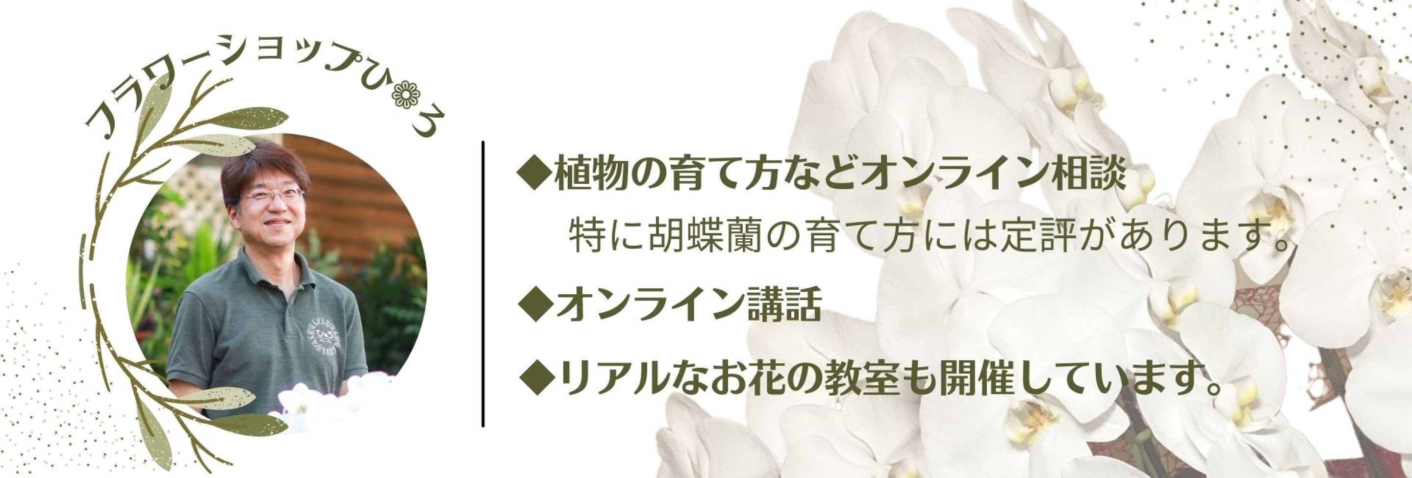 お花や植物のことならお任せください。フラワーショップひろオリジナルでも承ります。 ・お祝いや記念日(結婚、還暦など)の生花やプリザーブドフラワーのアレンジメント ・日本フラワーデザイナー協会認定講師(NFD講師)であり植物好きの店主の相談、アドバイス ※特に胡蝶蘭の育て方には定評があります。 ・子供会、婦人会など各種団体様各種講習会もお任せください。 ・お花の教室…お花を楽しみたい方や日本フラワーデザイナー協会の資格取得したい方 【お問合せは、当ショップの『お問合せ』フォームよりお願いたします。】