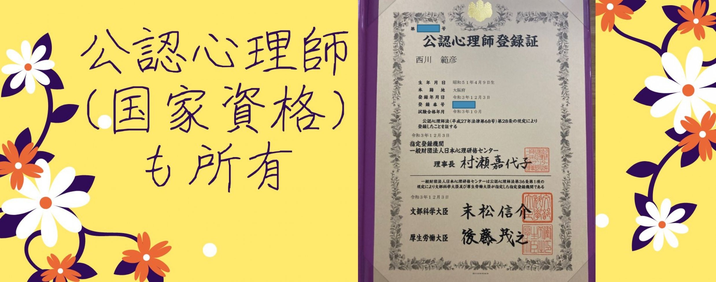 | 資格・免許 | 公認心理師(国家資格)・ ヘルスカウンセリング学会公認健康心理療法士®・ 認定発達しょうがいアドバイザー・ 和みのヨーガインストラクター・ 管理栄養士(国家資格) 【西川範彦】 |
