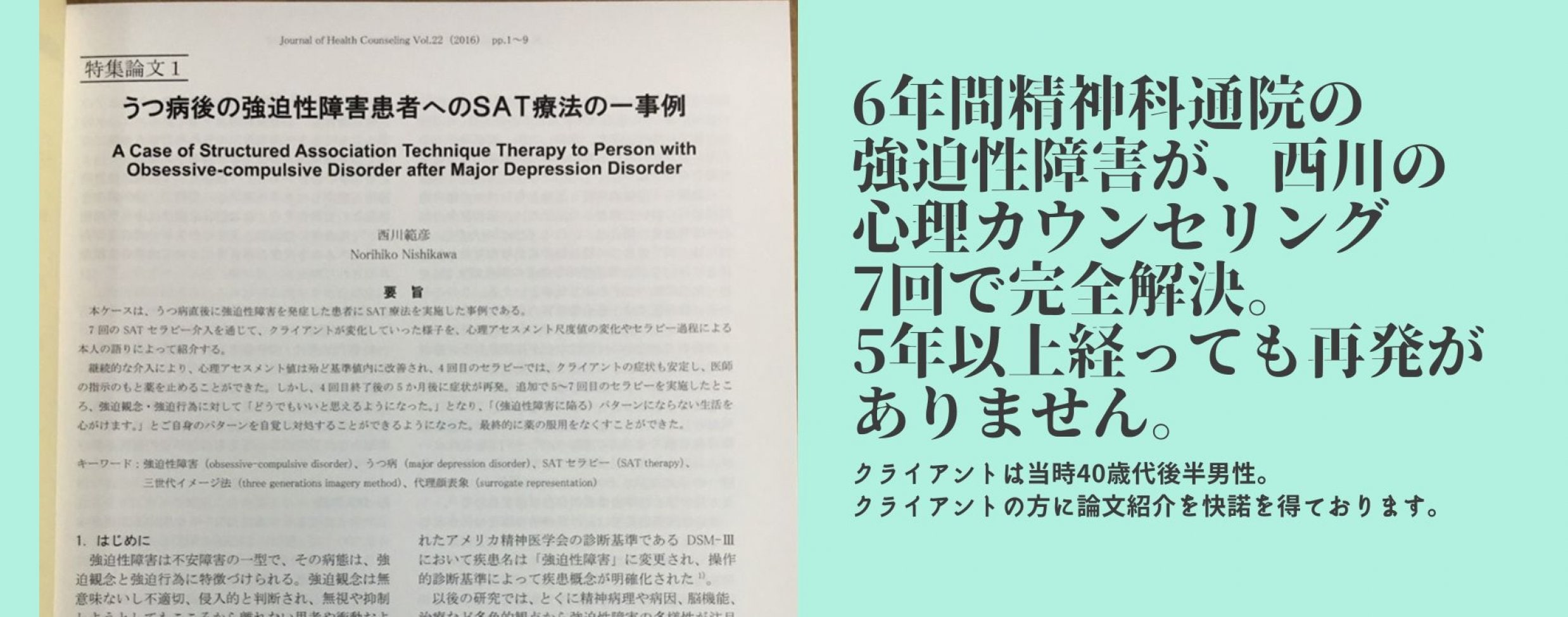 ☆『うつ病後の強迫性障害患者へのSAT療法の一事例』6年間精神科に通われていたクライアントが7回のカウンセリングで解決・7年後の現在も再発なしの事例↓↓