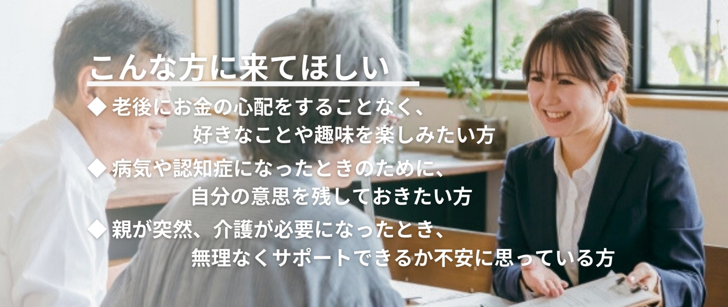 老後を楽しく過ごすことができるように、サポートすること、相続や介護などの面倒なことをできるだけ「楽」に対処できるようにすることが私の役割です。