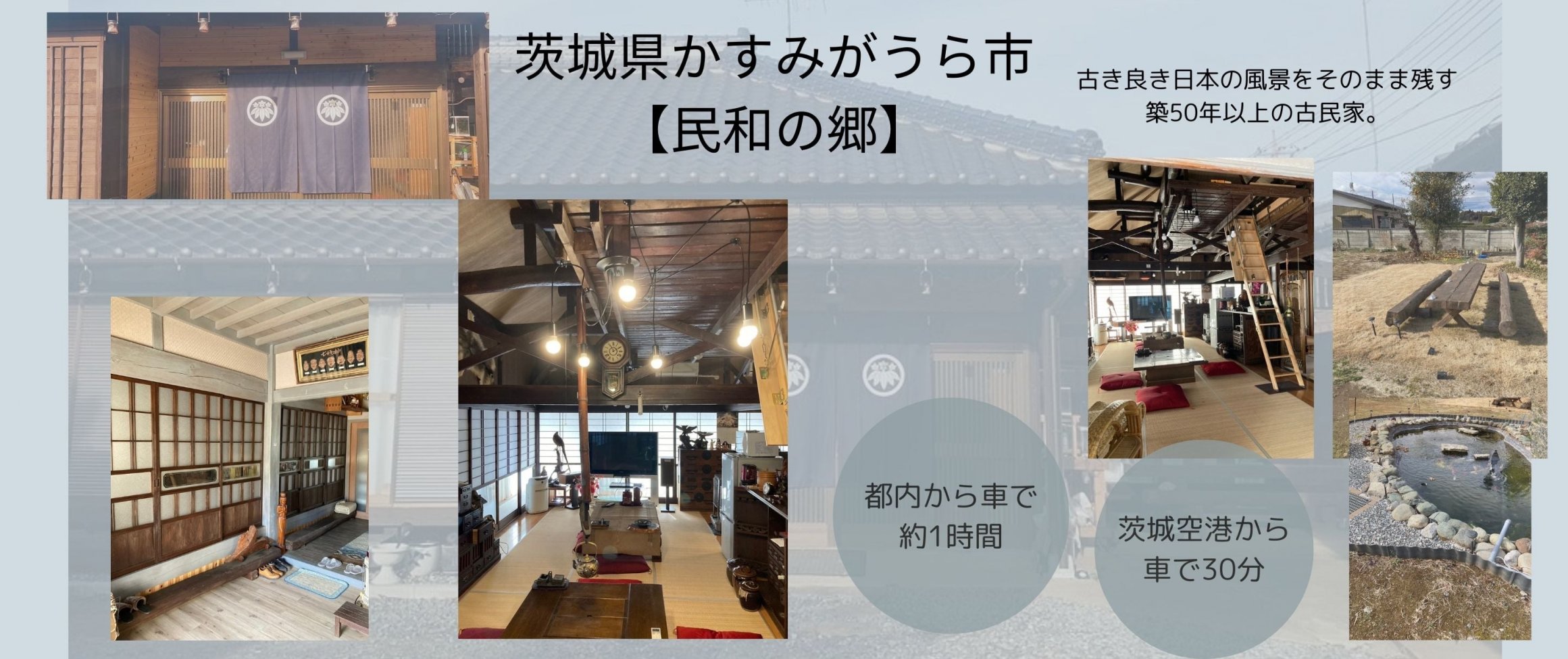 民泊|茨城県かすみがうら市【民和の郷】 古き良き日本の風景をそのまま残す、築50年以上の古民家。 木々のぬくもりと、懐かしい日本の暮らしに包まれて、心安らぐひとときをお過ごしください。 【アクセス】 都内から車で約1時間(常磐自動車道経由) 茨城空港から車で30分 心安らぐ古民家での滞在をお楽しみください。 ★宿泊プラン https://home.tsuku2.jp/f/minpaku/privatelodging