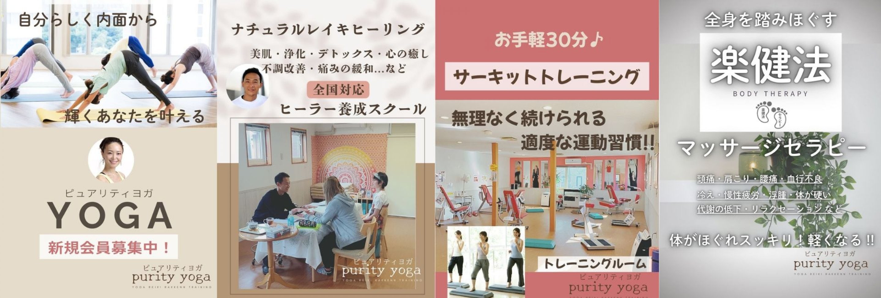 2011年からヨガ教室を始め、今年14年目を迎えております。2020年5月に移転リニューアルをして今のヨガスタジオが誕生し、「ピュアリティヨガ」でできることが「ヨガ」だけではなく、「レイキヒーリング」「サーキットトレーニング」「楽健法セラピー」とメニューが増えました。