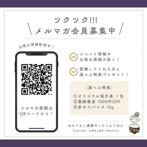 | メールマガジン登録 | ショップオープン記念!!おもてなし薬膳せっちゃんごはんの新規メルマガご登録いただいた方限定で『選べる3つの特典』をプレゼントします。 郵送でお送りいたしますのでご登録後に出てくるクーポンをゲット 頂き、クーポン内に記載のアドレス宛に必要事項記入の上メッセージお願いします! ※お一人様一回限り有効 ※発送に1〜3週間程、時間がかかる場合があります。薬膳商品お得情報や教室開催日程等お伝えしていきます。 |