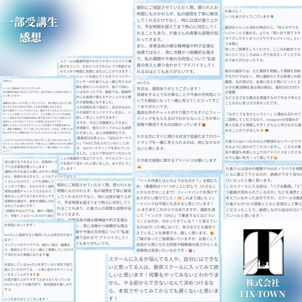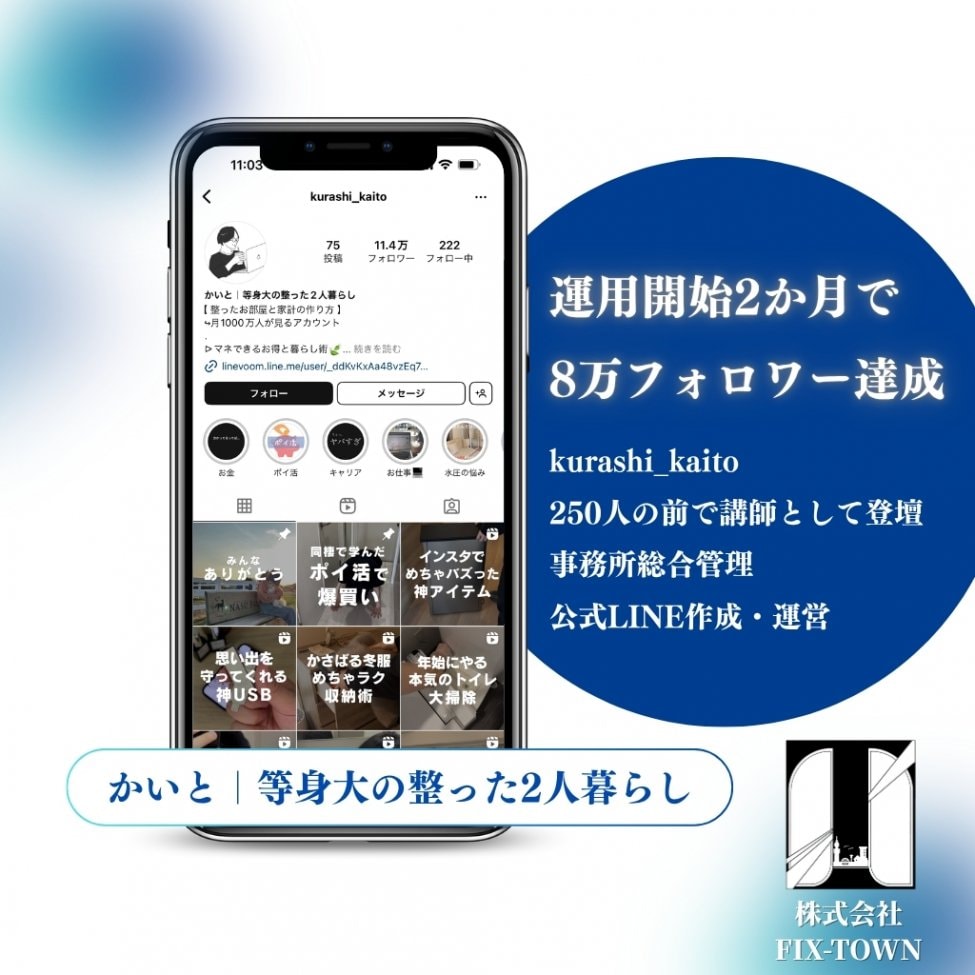 株式会社FIX-TOWNは、「さぁ、はじめよう。」を合言葉に、挑戦と信頼が積み上がる街(構造)を設計するマーケティングカンパニーです。 SNS運用(Instagram/Youtube)・LINE構築・Web広告・インフルエンサーマーケティングを複合し、お客様の想いを顧客へ導く“マーケティング導線”を提供します。 感覚的な運用ではなく、圧倒的リサーチから創る構造設計で、サービスの認知拡大を共に伴走します。