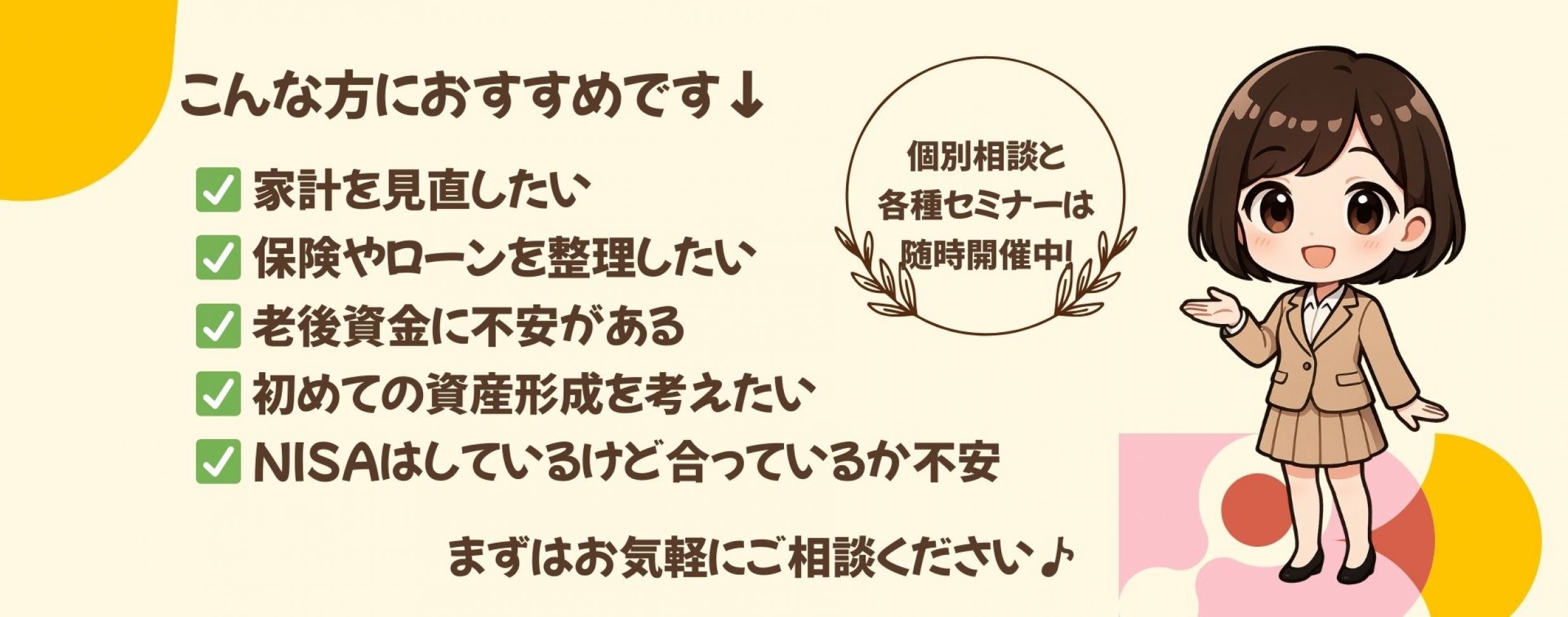 無理なく続けられるライフプランとお金の仕組みづくりを、二人三脚でサポートします。