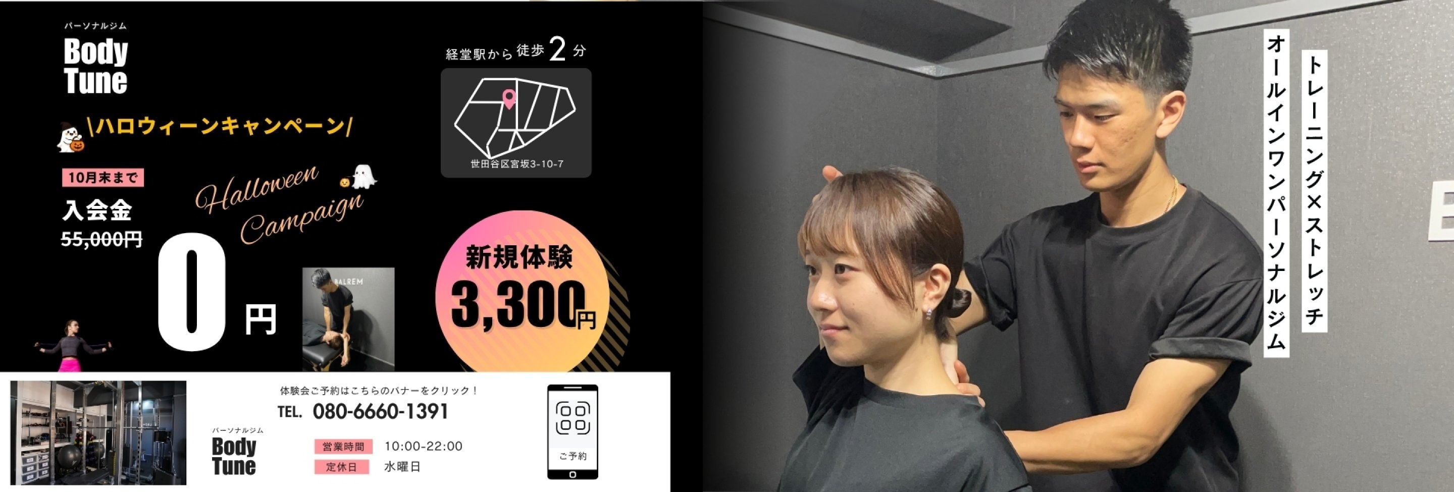 経堂にあるBody Tunをメイン拠点とし、渋谷でも対応が可能です。ライフスタイルやご希望に合わせて通いやすい場所を選べるのが特徴です。