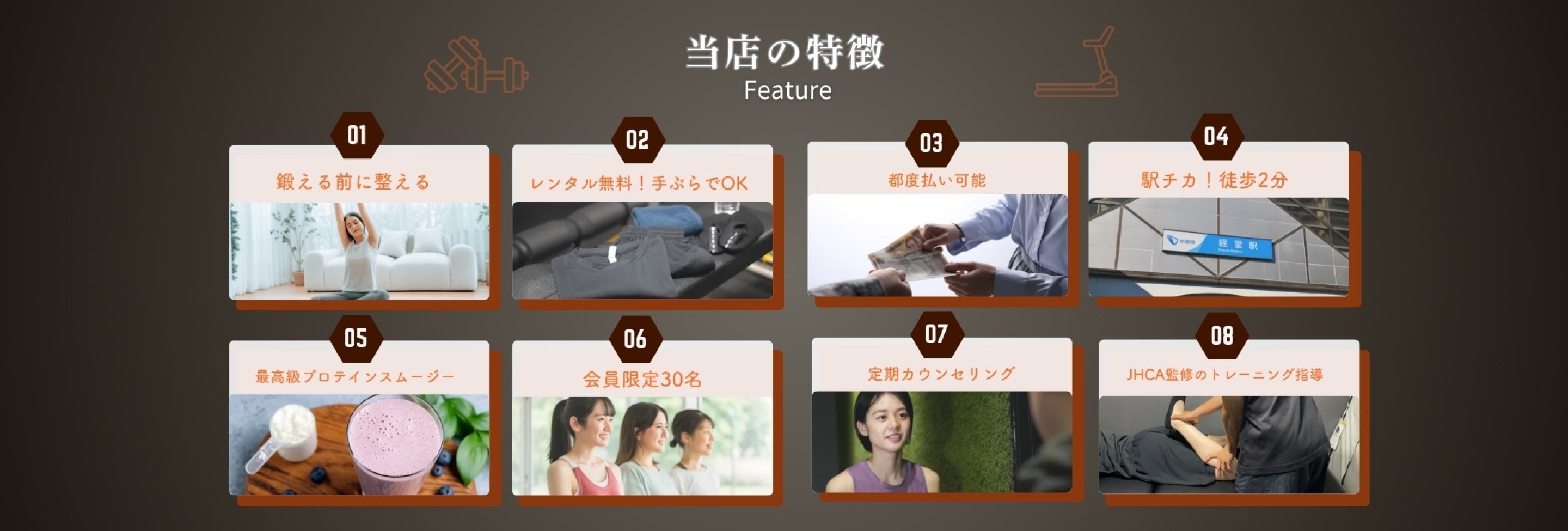 ウェア・シューズ・タオルの無料レンタルがあり、手ぶらで通えるのも魅力。お仕事帰りやお出かけの合間にも気軽に立ち寄れます。さらに、会員数を限定しているため、トレーナーが一人ひとりにしっかり寄り添った指導を行える環境です。ダイエット・ボディメイクはもちろん、肩こりや腰痛など体の不調改善を目的とした方にもおすすめです。