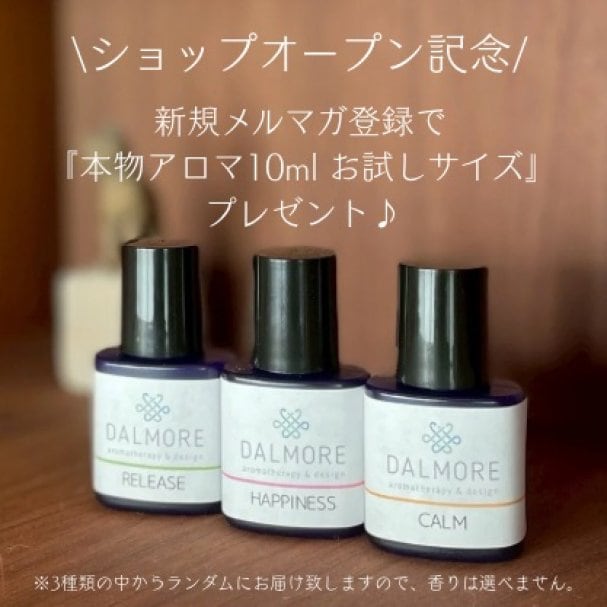 ショップオープン記念!!DALMOREの新規メルマガ登録いただいた方限定で『本物アロマ10ml お試しサイズ』をプレゼントします。 郵送でお送りいたしますのでご登録後に出てくるクーポンをゲット頂き、クーポン内に記載のアドレス宛に必要事項記入の上メッセージお願いします!!なお3種類のうちからランダムにお届けいたしますので、香りはお選びいただけないことご了承ください。